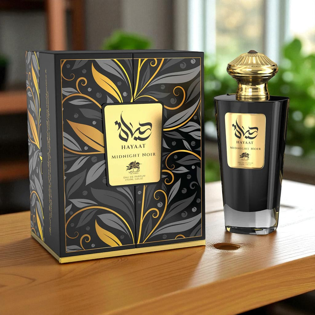 Dive into the opulent mystery of Hayaati Midnight Noir, a bold and luxurious Eau De Parfum designed to leave an unforgettable impression. The fragrance opens with exotic passionfruit, fruity nuances, Turkish rose, and a hint of saffron—creating an alluring, vibrant introduction. Deep heart notes of rich agarwood (oud), Indonesian patchouli, and warm benzoin evoke depth and intrigue, while a velvety base of leather, akigalawood, amber, labdanum, and vanilla wraps the scent in irresistible elegance.